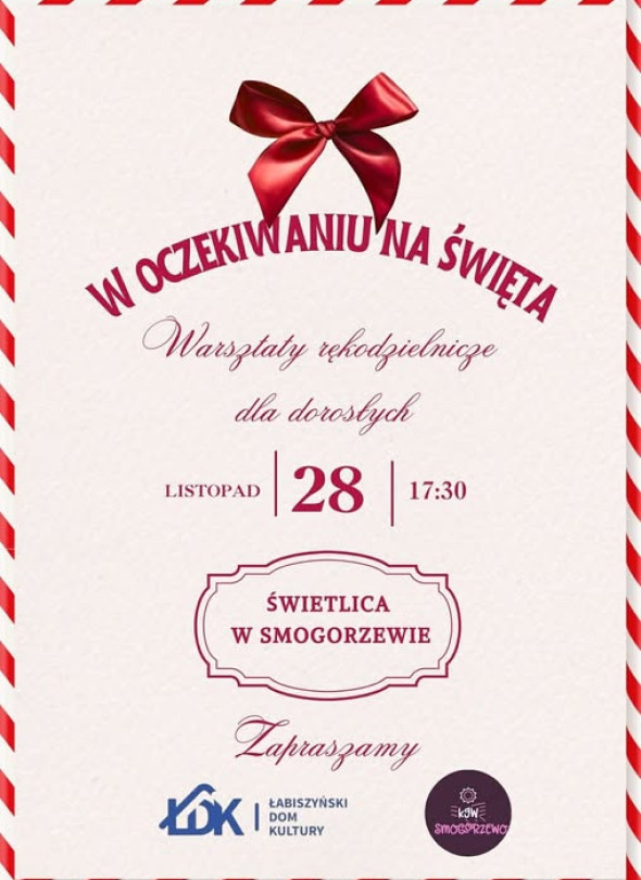 28 listopada w świetlicy w Smogorzewie odbędą się warsztaty rękodzielnicze dla dorosłych „W oczekiwaniu na święta”, początek o godz. 17:30, organizatorzy zapraszają na spotkanie przygotowane przez Łabiszyński Dom Kultury oraz KGW Smogorzewo.