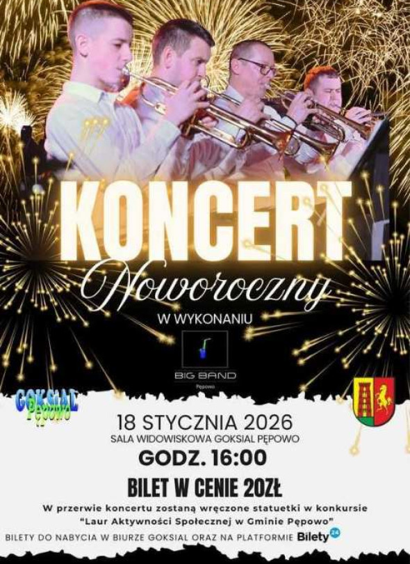 18 stycznia 2026, Sala widowiskowa GOKSiAL w Pępowie, godz. 16:00 odbędzie się Koncert Noworoczny w wykonaniu Big Band Pępowo. Bilet w cenie 20 zł, w przerwie koncertu zostaną wręczone statuetki w konkursie „Laur Aktywności Społecznej w Gminie Pępowo”. Bilety do nabycia w biurze GOKSiAL oraz na platformie Bilety24.