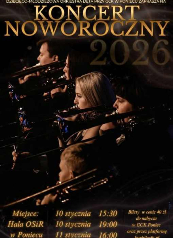10 stycznia 2026 roku w Hali OSiR w Poniecu odbędzie się Koncert Noworoczny w wykonaniu Dziecięco Młodzieżowej Orkiestry Dętej przy GCK w Poniecu, zaplanowano trzy odsłony wydarzenia o godzinach 15:30 i 19:00 tego samego dnia oraz 11 stycznia o 16:00, bilety w cenie 40 zł są do nabycia w GCK Poniec oraz online na platformie kupbilecik.pl.