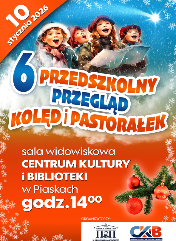 10 stycznia 2026 roku w Piaskach o godz. 14:00 w sali widowiskowej Centrum Kultury i Biblioteki odbędzie się 6 Przedszkolny Przegląd Kolęd i Pastorałek. Wydarzenie organizują Fundacja Dziedzictwo bł. Edmunda Bojanowskiego oraz Centrum Kultury i Biblioteki w Piaskach, na scenie zaprezentują się przedszkolaki z kolędami i pastorałkami.