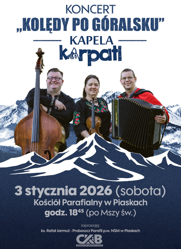 3 stycznia 2026 roku w Piaskach o godz. 18.45 w kościele parafialnym odbędzie się koncert „Kolędy po góralsku” w wykonaniu kapeli Karpatia. Wydarzenie rozpocznie się po Mszy św., a na program złożą się kolędy i pastorałki w góralskich aranżacjach, na koncert zapraszają ks. Rafał Jarmuż oraz Centrum Kultury i Biblioteka w Piaskach.
