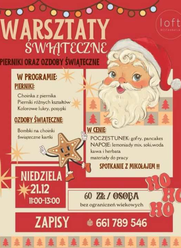 21 grudnia 2025 roku w Restauracji Loft odbędą się warsztaty świąteczne z pieczeniem pierników i przygotowywaniem ozdób, w godz. 11:00 do 13:00. W programie są między innymi choinka z piernika, pierniki w różnych kształtach oraz dekorowanie ich kolorowymi lukrami i posypkami, a także robienie bombek na choinkę i świątecznych kartek. Koszt udziału to 60 zł od osoby, bez ograniczeń wiekowych, w cenie jest poczęstunek i napoje oraz materiały do pracy, organizatorzy zapowiadają też spotkanie z Mikołajem. Zapisy prowadzone są pod numerem 661 789 546.