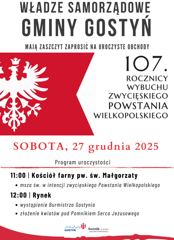 W sobotę 27 grudnia 2025 roku w Gostyniu odbędą się uroczyste obchody 107. rocznicy wybuchu zwycięskiego Powstania Wielkopolskiego, o godzinie 11.00 w kościele farnym pw. św. Małgorzaty zaplanowano mszę świętą w intencji Powstania, a o godzinie 12.00 na gostyńskim rynku odbędzie się wystąpienie burmistrza Gostynia oraz złożenie kwiatów pod Pomnikiem Serca Jezusowego.