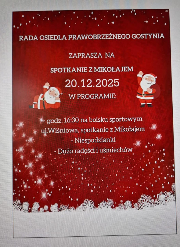 20 grudnia 2025 roku o godzinie 16:30 na boisku sportowym przy ulicy Wiśniowej w Gostyniu odbędzie się spotkanie z Mikołajem organizowane przez Radę Osiedla Prawobrzeżnego Gostynia. W programie przewidziano spotkanie z Mikołajem, niespodzianki oraz wspólną zabawę pełną radości i uśmiechów. Wstęp wolny.