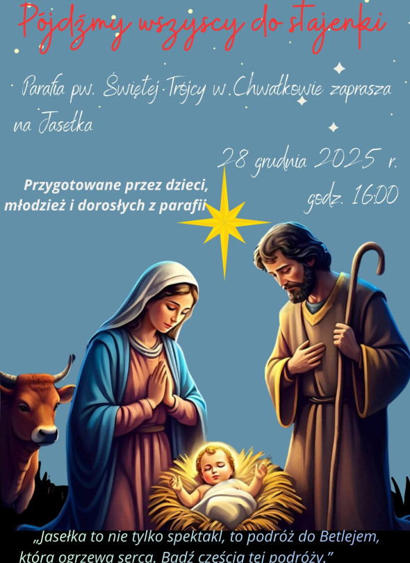 28 grudnia 2025 roku w Chwałkowie w Parafii pw. Świętej Trójcy odbędą się jasełka przygotowane przez dzieci, młodzież i dorosłych z parafii. Początek wydarzenia zaplanowano na godzinę 16.00. Przedstawienie ma charakter świąteczny i nawiązuje do tradycyjnej opowieści o Bożym Narodzeniu, zapraszając widzów do wspólnego przeżywania tej historii.