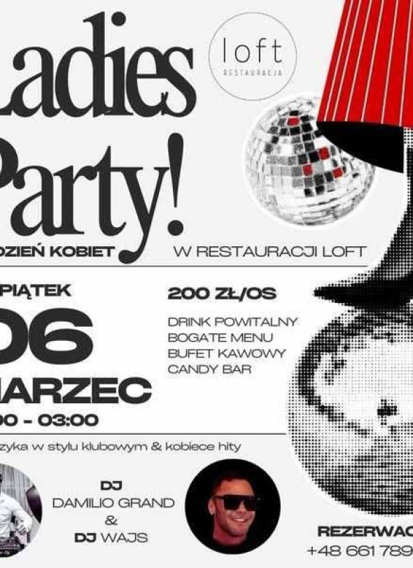 6 marca 2026 roku w restauracji Loft odbędzie się Ladies Party z okazji Dnia Kobiet, zaplanowane w piątek w godz. 19:00–03:00, z muzyką klubową i kobiecymi hitami w wykonaniu DJ Damilio Grand oraz DJ Wajs, w cenie 200 zł od osoby obejmującej drink powitalny, bogate menu, bufet kawowy i candy bar,