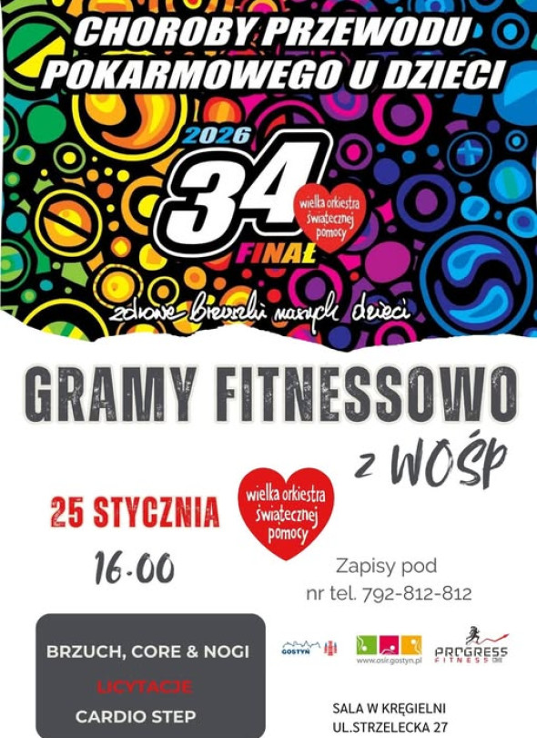25 stycznia o godz. 16:00 w sali w Kręgielni przy ul. Strzeleckiej 27 w Gostyniu odbędzie się wydarzenie „Gramy fitnessowo z WOŚP”, w programie zaplanowano zajęcia brzuch, core i nogi oraz cardio step, a także licytacje, zapisy prowadzone są pod numerem telefonu 792 812 812.