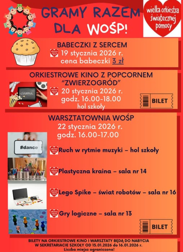 19 stycznia 2026 r. w Szkole Podstawowej Nr 1 z Oddziałami Integracyjnymi im. Czarnego Legionu odbędzie się akcja „Babeczki z sercem”, cena jednej babeczki wynosi 3 zł, 20 stycznia 2026 r. w godz. 16.00–18.00 w holu szkoły zaplanowano orkiestrowe kino z popcornem z filmem „Zwierzogród”, a 22 stycznia 2026 r. w godz. 16.00–17.00 odbędzie się „Warsztatownia WOŚP”, w programie ruch w rytmie muzyki w holu szkoły, „Plastyczna kraina” w sali nr 14, „Lego Spike, świat robotów” w sali nr 16 oraz gry logiczne w sali nr 13, bilety na orkiestrowe kino i warsztatownię będą do nabycia w sekretariacie szkoły od 15.01.2026 do 16.01.2026, liczba miejsc jest ograniczona.
