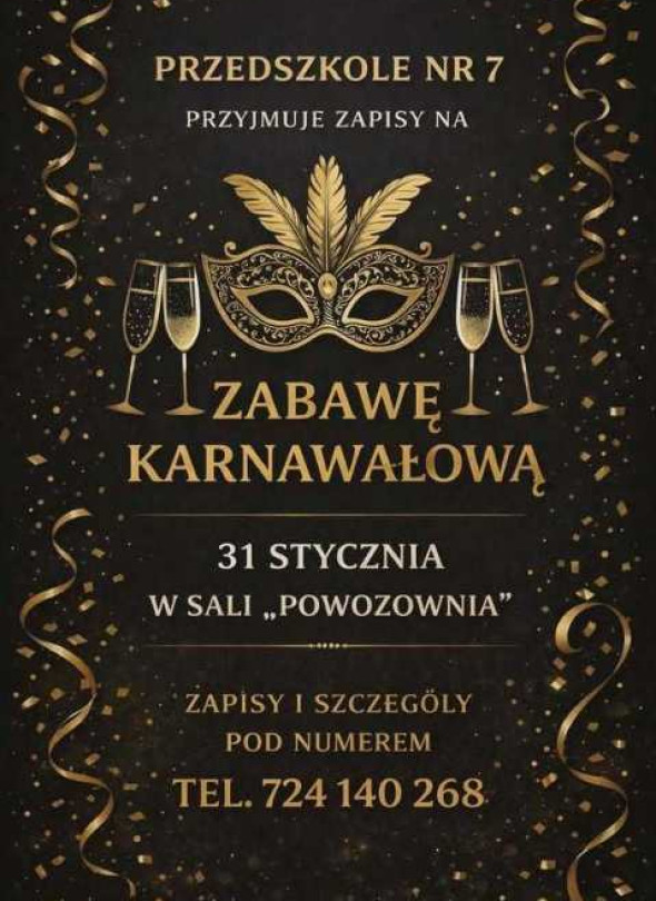 31 stycznia w sali „Powozownia” odbędzie się zabawa karnawałowa organizowana przez Przedszkole nr 7, zapisy i szczegóły dostępne są pod numerem telefonu 724 140 268.