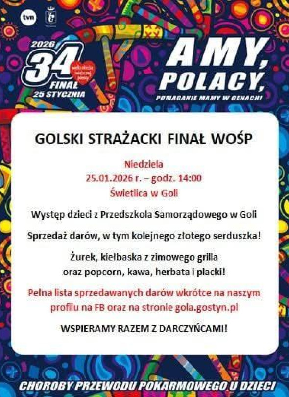 25 stycznia 2026 w Goli odbędzie się Golski Strażacki Finał WOŚP, wydarzenie rozpocznie się o godz. 14:00 w Świetlicy w Goli, w programie zaplanowano występ dzieci z Przedszkola Samorządowego w Goli oraz sprzedaż darów, w tym kolejnego złotego serduszka, a na miejscu będzie można kupić także żurek, kiełbaskę z domowego grilla, popcorn, kawę, herbatę i placki.
