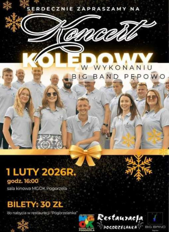 1 lutego 2026 w Pogorzeli odbędzie się koncert kolędowy w wykonaniu Big Band Pępowo, wydarzenie zaplanowano na godz. 16:00 w sali kinowej MGOK Pogorzela, bilety w cenie 30 zł można kupić w restauracji „Pogorzelanka”.