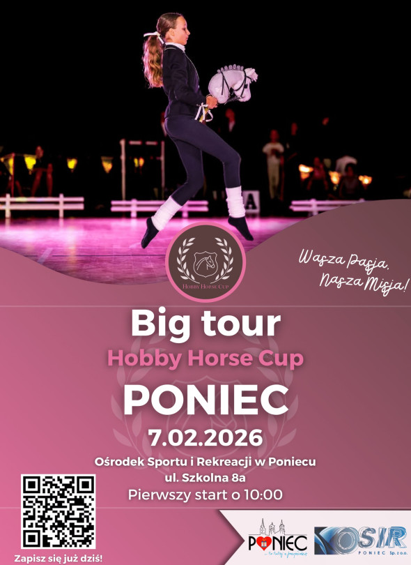 7 lutego 2026 roku w Poniecu odbędzie się Big tour Hobby Horse Cup, a pierwszy start zaplanowano na godzinę 10:00 w Ośrodku Sportu i Rekreacji w Poniecu przy ul. Szkolnej 8a, na uczestników czeka sportowa rywalizacja w hobby horsingu, a zapisy trwają, szczegóły dostępne są po zeskanowaniu kodu QR z plakatu.