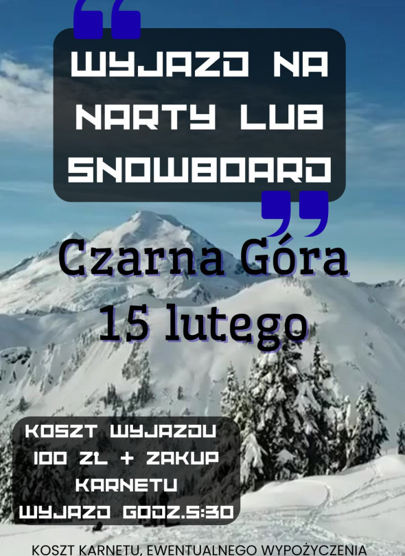 15 lutego odbędzie się wyjazd na narty lub snowboard na Czarną Górę organizowany przez Ośrodek Sportu i Rekreacji w Poniecu, wyjazd zaplanowano na godzinę 5:30, koszt wyjazdu wynosi 100 zł plus zakup karnetu, a koszty karnetu, ewentualnego wypożyczenia sprzętu oraz wyżywienia pokrywa uczestnik, zapisy prowadzone są do 10 lutego w hali sportowej.