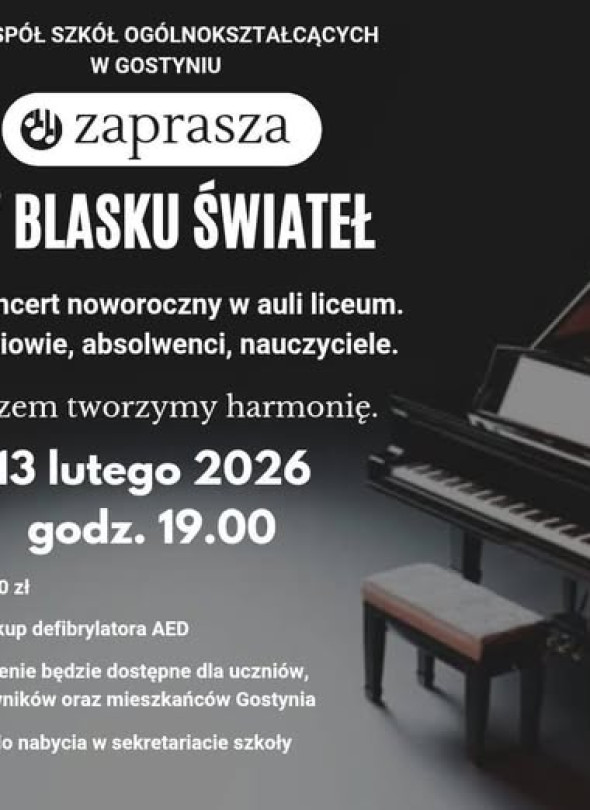 13 lutego 2026 roku w auli liceum Zespołu Szkół Ogólnokształcących w Gostyniu odbędzie się noworoczny koncert pod hasłem „W blasku świateł”, zaplanowany na godzinę 19.00. Wydarzenie przygotowują uczniowie, absolwenci oraz nauczyciele szkoły, a jego celem jest wspólne muzykowanie oraz zbiórka środków na zakup defibrylatora AED, który będzie dostępny dla uczniów, pracowników i mieszkańców Gostynia. Bilet wstępu kosztuje 30 zł, wejściówki można nabyć w sekretariacie szkoły.