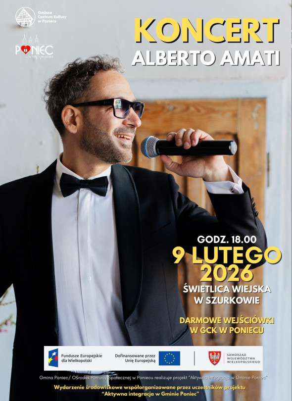 9 lutego 2026 roku o godzinie 18.00 w Świetlicy Wiejskiej w Szurkowie odbędzie się koncert Alberto Amati, artysty wykonującego repertuar inspirowany muzyką włoską i klasyczną. Wstęp na wydarzenie jest bezpłatny, darmowe wejściówki dostępne są w Gminnym Centrum Kultury w Poniecu. Koncert realizowany jest w ramach projektu „Aktywna integracja w Gminie Poniec”.