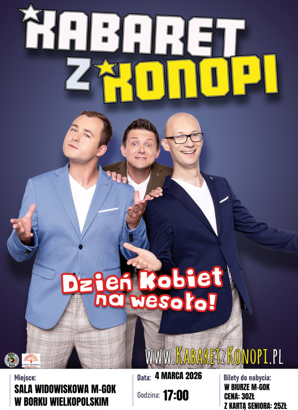 4 marca 2026 roku w Sali Widowiskowej M-GOK w Borku Wielkopolskim odbędzie się występ Kabaretu z Konopi z okazji Dnia Kobiet, początek zaplanowano na godzinę 17.00. Bilety dostępne są w biurze M-GOK, cena wynosi 30 zł, a z Kartą Seniora 25 zł.