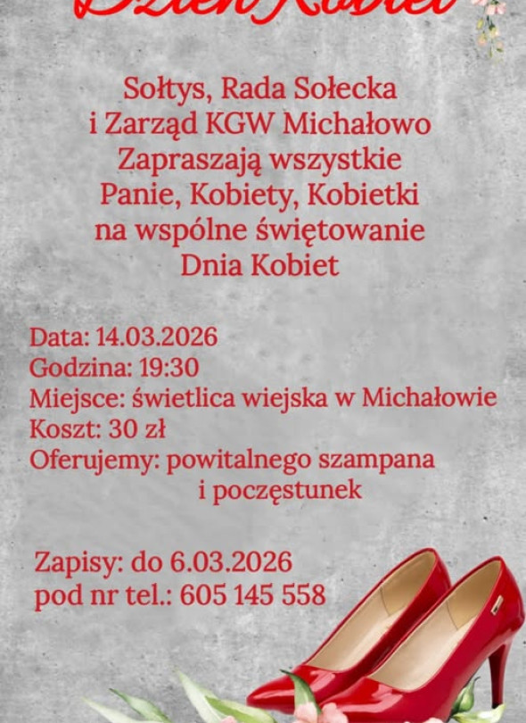 14 marca 2026 roku w Michałowie odbędzie się spotkanie z okazji Dnia Kobiet, organizowane przez sołtysa, Radę Sołecką oraz Zarząd KGW Michałowo. Początek zaplanowano na godzinę 19:30 w świetlicy wiejskiej w Michałowie, koszt udziału wynosi 30 zł, a w programie przewidziano powitalnego szampana i poczęstunek. Zapisy przyjmowane są do 6 marca 2026 roku pod numerem telefonu 605 145 558.