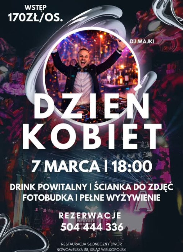 7 marca o godz. 18:00 w Restauracji Słoneczny Dwór przy ul. Nowomiejskiej 38 w Książu Wielkopolskim odbędzie się impreza z okazji Dnia Kobiet. W programie muzyka z DJ-em Majkim, drink powitalny, ścianka do zdjęć, fotobudka oraz pełne wyżywienie. Koszt wstępu wynosi 170 zł od osoby. Rezerwacje przyjmowane są pod numerem 504 444 336.