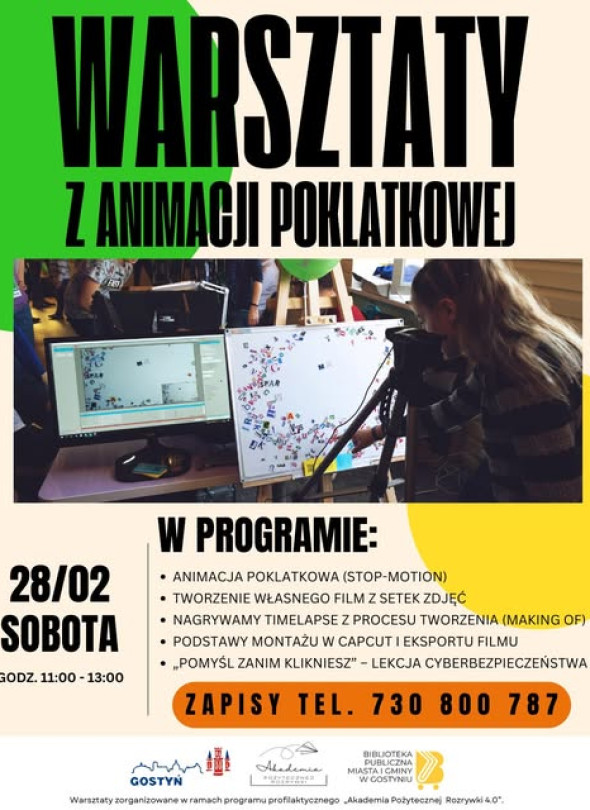 28 lutego w godzinach 11:00–13:00 w Bibliotece Publicznej Miasta i Gminy w Gostyniu odbędą się warsztaty z animacji poklatkowej. W programie przewidziano animację stop motion, tworzenie własnego filmu z setek zdjęć, nagranie timelapse z procesu powstawania materiału, podstawy montażu w aplikacji CapCut oraz lekcję cyberbezpieczeństwa „Pomyśl, zanim klikniesz”. Zapisy pod numerem telefonu 730 800 787.