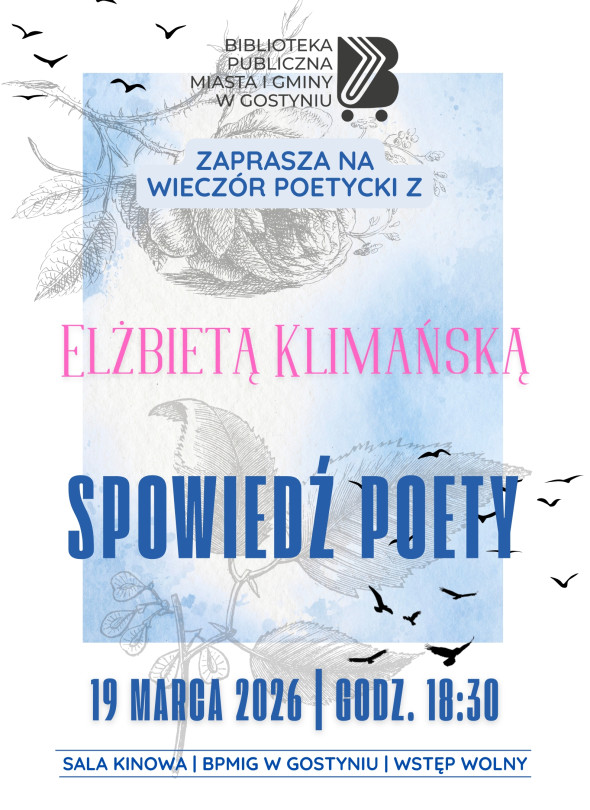 19 marca 2026 roku o godz. 18:30 w sali kinowej Biblioteki Publicznej Miasta i Gminy w Gostyniu odbędzie się wieczór poetycki z Elżbietą Klimańską pod tytułem „Spowiedź poety”. Spotkanie organizuje Biblioteka Publiczna Miasta i Gminy w Gostyniu. Wstęp na wydarzenie jest wolny.