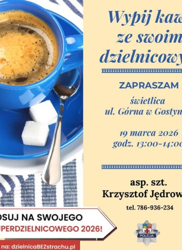 19 marca 2026 roku w godz. 13:00–14:00 w świetlicy przy ul. Górnej w Gostyniu odbędzie się spotkanie „Wypij kawę ze swoim dzielnicowym”. W wydarzeniu weźmie udział asp. szt. Krzysztof Jedrowiak, a uczestnicy będą mieli możliwość rozmowy w swobodnej atmosferze. Kontakt do organizatora: tel. 786 936 234.
