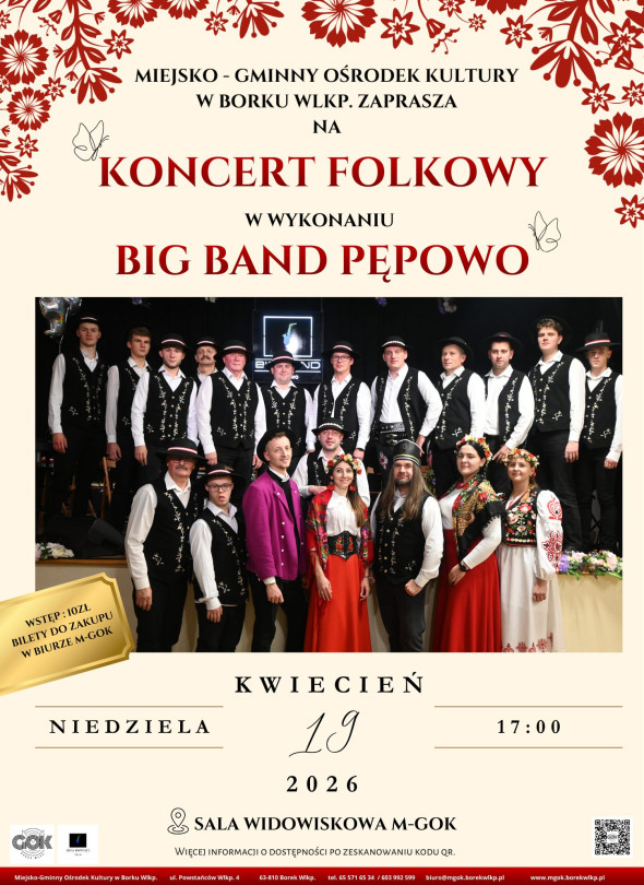 19 kwietnia 2026 roku w Borku Wielkopolskim, w sali widowiskowej Miejsko-Gminnego Ośrodka Kultury, odbędzie się koncert folkowy w wykonaniu zespołu Big Band Pępowo, początek zaplanowano na godz. 17:00, wstęp kosztuje 10 zł, bilety dostępne są w biurze M-GOK.