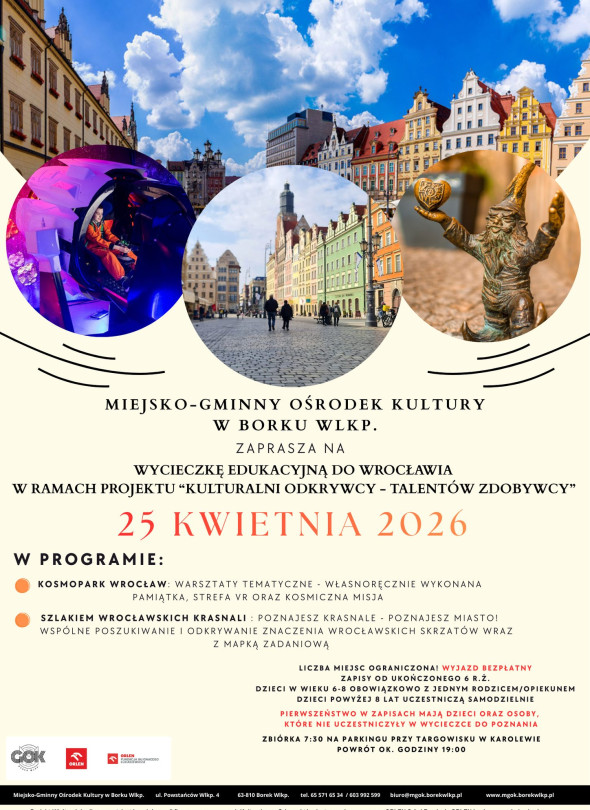 25 kwietnia 2026 roku odbędzie się wycieczka edukacyjna do Wrocławia organizowana przez Miejsko-Gminny Ośrodek Kultury w Borku Wlkp. w ramach projektu „Kulturalni odkrywcy – talentów zdobywcy”, w programie przewidziano warsztaty w Kosmoparku Wrocław, strefę VR i misję kosmiczną oraz zwiedzanie miasta szlakiem krasnali z mapą zadaniową, wyjazd jest bezpłatny, liczba miejsc ograniczona, zapisy dla dzieci od 6. roku życia, zbiórka o godz. 7.30 na parkingu przy targowisku w Karolewie, powrót około godz. 19.00.