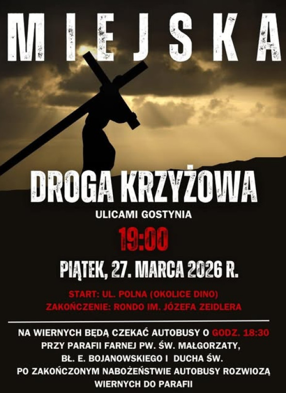 27 marca 2026 roku o godz. 19.00 ulicami Gostynia przejdzie Miejska Droga Krzyżowa, która rozpocznie się przy ul. Polnej w okolicach Dino, a zakończy przy rondzie im. Józefa Zeidlera, dla wiernych zostaną podstawione autobusy o godz. 18.30 przy parafii farnej pw. św. Małgorzaty, bł. Edmunda Bojanowskiego i Ducha Świętego, po zakończeniu nabożeństwa uczestnicy zostaną odwiezieni do parafii.
