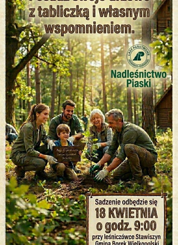 18 kwietnia 2026 roku o godz. 9:00 w Leśnictwie Stawiszyn w gminie Borek Wielkopolski odbędzie się akcja sadzenia drzew w ramach inicjatywy „Las Dobrych Wspomnień”, podczas której uczestnicy będą mogli posadzić własne drzewko z tabliczką i dedykacją, upamiętniając ważne wydarzenia lub osoby, a także stworzyć symboliczne miejsce na przyszłość, liczba miejsc jest ograniczona, zapisy trwają jeszcze tylko przez kilka dni, szczegóły dostępne są w komentarzu organizatora.