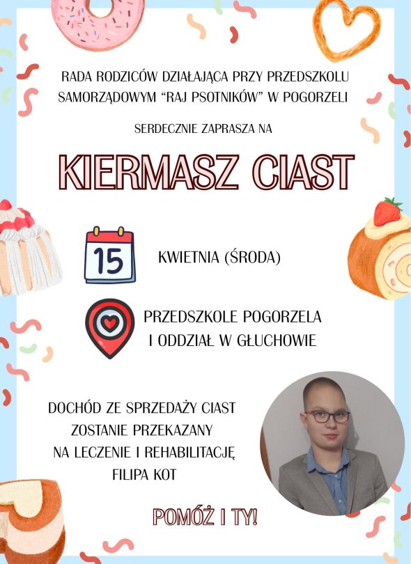 15 kwietnia 2026 roku w Przedszkolu Samorządowym „Raj Psotników” w Pogorzeli oraz w oddziale w Głuchowie odbędzie się kiermasz ciast organizowany przez Radę Rodziców. Dochód ze sprzedaży wypieków zostanie przeznaczony na leczenie i rehabilitację Filipa Kota.