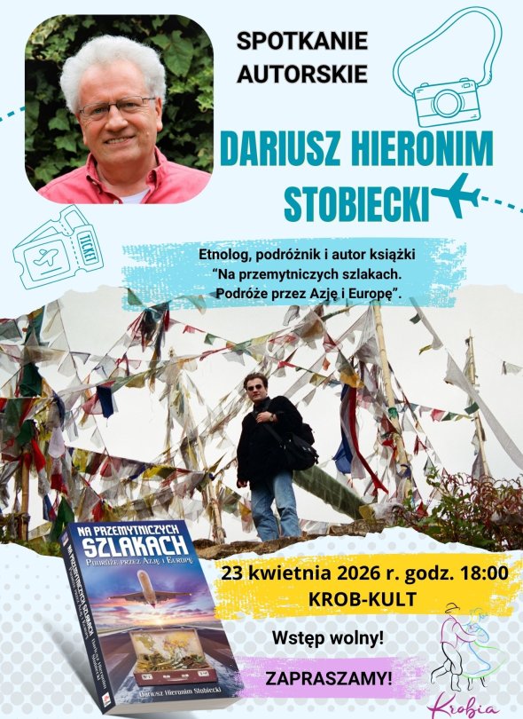 23 kwietnia 2026 roku o godz. 18:00 w Krob-Kult w Krobi odbędzie się spotkanie autorskie z Dariuszem Hieronimem Stobieckim, etnologiem, podróżnikiem i autorem książki „Na przemytniczych szlakach. Podróże przez Azję i Europę”, w trakcie którego uczestnicy będą mogli poznać kulisy jego wypraw oraz doświadczenia z podróży, wstęp na wydarzenie jest wolny.