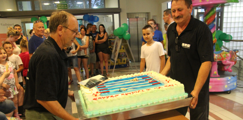 Jubileusz 10-lecia to poważna sprawa, dlatego nie mogło zabraknąć urodzinowego tortu w kształcie basenu, który stanął w głównym holu pływalni. Jego krojeniem zajęli się burmistrz Jerzy Kulak, a także dyrektor Zbigniew Kordus wraz z pracownikami. Nie była to jedyna urodzinowa atrakcja. Tego dnia basen był wyjątkowo otwarty do północy, a goście bawili się na wodnej dyskotece. Był DJ, występ saksofonistki, drinki bezalkoholowe pod żywymi palmami i atmosfera świętowania, która udzieliła się wszystkim.