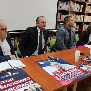 Kolejnym kandydatem, który zaprezentował się w bibliotece był Maciej Jóźwiak (35l.) ze Środy Wlkp, który już na początku stwierdził, że nie czuje się politykiem, a startuje, bo obecni politycy nie sprawdzili się. - Nie bronią interesów Polski w sposób należyty. - mówił Maciej Jóźwiak. - Natomiast zarówno ja, jak i koledzy idziemy do polityki, by stać twardo, by nie uginać się przed Niemcami, przed Unią, Amerykanami i Żydami - przekonywał kandydat. Podkreślał, że Unia Europejska zabrała Polsce niepodległość, a ideologie europejskie niszczą polską tożsamość i korzenie. Zachęcał zebranych do zapoznania się z tzw. Białą Księgą traktującą o przyszłości Unii Europejskiej.