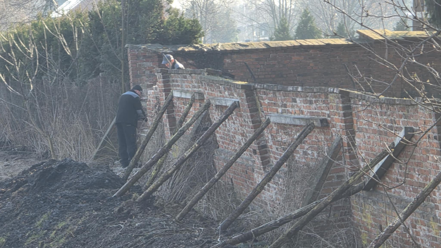 Na razie rozbierany jest tylko fragment muru, ale już widać, że całość będzie procesem liczonym raczej w miesiącach niż w tygodniach. Ekipa rozpoczęła prace w poniedziałek. Samo rozbieranie nie ruszyło od razu pełną parą, bo wcześniej konieczne było przygotowanie i zabezpieczenie terenu. Dopiero potem przyjdzie czas na odbudowę. Jak słyszymy na miejscu, mur ma zostać odtworzony w tym samym miejscu, ale już bez drewnianych elementów, które przez długi czas pełniły funkcję prowizorycznych podpór. To właśnie drewniane pale wbite od strony bulwaru od dawna zwracały uwagę mieszkańców i pokazywały, że zabytkowe ogrodzenie jest w coraz gorszym stanie.