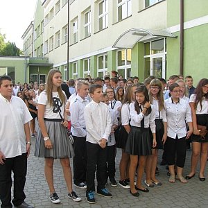 Po zakończeniu eucharystii wszyscy przemaszerowali na dziedziniec pępowskiego gimnazjum. Oficjalna uroczystość rozpoczęła się odśpiewaniem hymnu państwowego oraz uczczeniem minutą ciszy pamięci wszystkich poległych i pomordowanych w czasie II wojny światowej. – Rok 2015/2016 został ogłoszony przez Ministra Edukacji Narodowej „Rokiem otwartej szkoły”, czyli szkoły, która nie zamyka się na kulturę, sztukę, sport, lokalne środowisko. Sądzę, że my właśnie taką szkołą jesteśmy. Ten rok powinien nam sprzyjać – mówiła dyrektor ZSSPiG Cyryla Krajka, po czym serdecznie życzyła uczniom entuzjazmu w zdobywaniu wiedzy i aktywności w działaniu, nauczycielom – radości i sukcesów w pracy zawodowej, a rodzicom – jak najmniej trosk i dobrej współpracy ze szkołą.