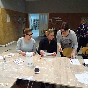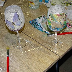 Warsztaty poprowadziła Monika Rolnik, która tym razem zrezygnowała z techniki decoupage opanowanej w czasie poprzednich warsztatów. - Tym razem celem było stworzenie lampionu z kieliszka na papierze ryżowym. Jednym z fragmentów prac było naturalne suszenie ozdób na kieliszku. Etapy prac były następujące: przyklejenie papieru ryżowego do kieliszka, przytwierdzenie serwetki z motywem i podsuszanie. Dalej można było poprosić panią instruktor o wszelkiego rodzaju zdobienia, które musiały naturalnie wysychać około 20 minut – dodaje Leszek Żelazny. Wszystkie wykonane kieliszki uczestnicy zabrali ze sobą do domu.
