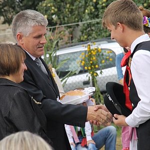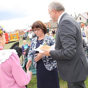 Następnie Maria Pawlak i Hieronim Twardowski, starościna i starosta dożynek przekazali gospodarzowi gminy, burmistrzowi Marianowi Jańczakowi chleb wypieczony z tegorocznego ziarna. Włodarz podziękował rolnikom za trud i zapewniał, że owoce wspólnej pracy, będzie dzielił sprawiedliwie. Złociste bochenki chleba wypieczone z tegorocznych plonów, otrzymali również wszyscy zaproszeni goście, którzy następnie wyruszyli w tłum, by dzielić się chlebem ze wszystkimi.