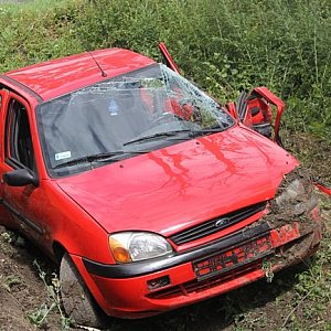 Wypadek na krajowej "dwunastce". Samochód osobowy na gostyńskich numerach rejestracyjnych, po zderzeniu z ciężarówką, wjechał do przydrożnego rowu. Dwie osoby zostały poszkodowane. Aby wyciągnąć kierowcę, strażacy musieli użyć specjalistycznego sprzętu.