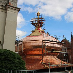 W pierwszej kolejności powstała drewniana konstrukcja wykonana z 35 metrów sześciennych belek, 17 metrów sześciennych desek i około 12 metrów sześciennych krążyny. Od blisko dwóch tygodni trwa obijanie kopuły blachą miedzianą, która jak usłyszeliśmy jest trwalsza i nierdzewna. Prace wymagają ogromnej precyzji i staranności. - Nic na siłę...Te roboty potrwają jeszcze co najmniej dwa tygodnie. Potem kopuła trafi na miejsce docelowe - mówili pracownicy