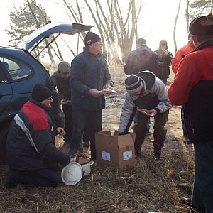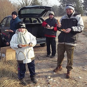 Kiedy około południa zakończono pracę na wszystkich czekała już gorąca kiełbaska . Podczas posiłku prezes koła Mieczysław Matuszewski przypomniał wszystkim , że za tydzień 12 lutego o godzinie 10:00 odbędzie się zebranie sprawozdawcze w Gminnym Ośrodku Kultury w Poniecu . Następne porządkowanie zaplanowano wstępnie na marzec , wtedy to członkowie koła zajmą się kolejnym stawem .