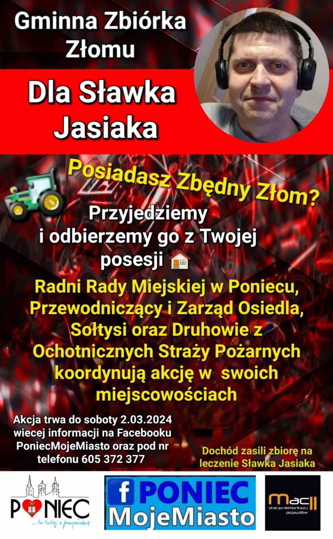 W akcję włączyli się radni gminy Poniec, sołtysi i strażacy z OSP, którzy koordynują zbiórki w swoich miejscowościach. Osoby, które chcą dostarczyć złom z innych okolic czy regionów powiatu mogą kontaktować się z organizatorami pod numerem tel. 605 372 377. Zebrany złom trafi następnie do firmy MACII Stacja Demontażu Pojazdów. Zbiórka potrwa do 2 marca.