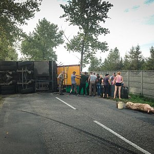 Wszystko wydarzyło się około godziny 15:30 na łuku drogi w miejscowości Lipie. Samochód, jadący w kierunku Piasków, zjechał na pobocze i przewrócił się na bok, blokując całą drogę. W pojeździe przewożonych było 101 sztuk trzody chlewnej. - Z samochodu trzeba było ewakuować część zwierząt, część sama wydostała się z pojazdu. Dziewięć sztuk padło na miejscu, zostały one przewiezione do "bakutilu" w Krobi. - mówi asp. sztab. Krzysztof Kasprzyk z KP PSP Gostyń. Pozostałe wyprowadzono na teren pobliskiego gospodarstwa.