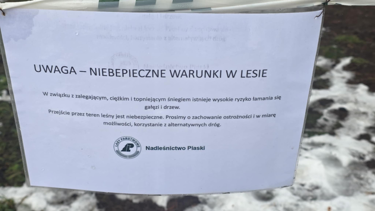 - Po opadach śniegu na koronach drzew zalegała gruba warstwa. Kiedy śnieg zaczął topnieć, stał się ciężki i gałęzie zaczęły się łamać - wyjaśnia Monika Prętkowska, rzecznik prasowy Nadleśnictwa Piaski. - Ze względu na to, że jest to las często uczęszczany, a dodatkowo stanowi drogę do szkoły, zdecydowaliśmy się na wywieszenie ostrzeżeń. Chodzi o to, żeby mieszkańcy mieli świadomość, że w tym miejscu może być niebezpiecznie - dodaje.