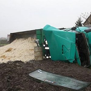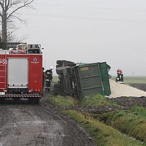 Miękkie i rozmokłe pobocze było prawdopodobnie przyczyną zdarzenia drogowego, do jakiego doszło dziś w Sułkowicach gmina Krobia. Samochód ciężarowy wiozący wysłodki dla jednego z gospodarstw przewrócił się na bok. Ranny został kierowca ciężarówki.