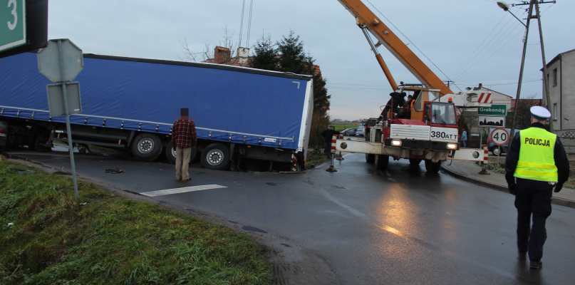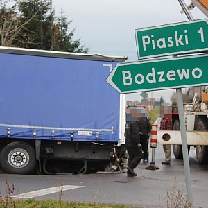 Kilka godzin trwały utrudnienia na skrzyżowaniu Piaski – Bodzewo - Grabonóg. Tir wypełniony po brzegi ładunkiem wpadł do rowu. Na miejsce dotarł ciężki sprzęt, aby wyciągnąć pojazd. Mimo obaw rozładowanie pojazdu nie było konieczne.
