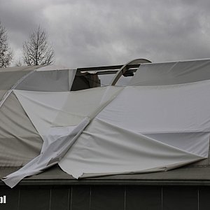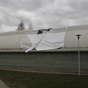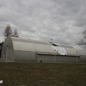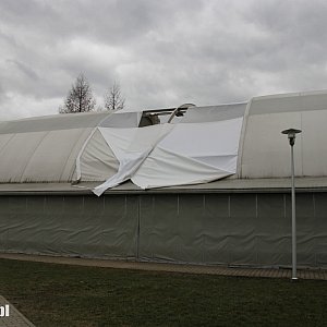 Silny wiatr zerwał fragment poszycia dachowego hali namiotowej służącej w okresie zimowym jako lodowisko, a wiosną i latem grającym w tenisa. Jak się okazuje częściowe szkody wyrządziły już wtorkowe wichury. Dzisiejsze podmuch...dokończyły dzieła.