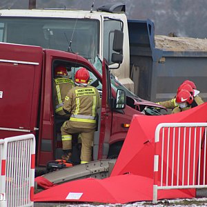 Wypadek na trasie Gostyń-Grabonóg. Zderzyły się dwa samochody - ciężarówka z busem. W jednym z pojazdów zakleszczony został jego kierowca, a dostęp do niego był bardzo utrudniony. W końcu udało się wyciągnąć mężczyznę i przekazać go załodze karetki pogotowia.