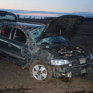 Poranny wypadek na wjeździe do Kosowa. Opel astra na prostym odcinku wypadł z drogi powiatowej, koziołkował i zatrzymał się w grząskim polu. Poszkodowany został kierowca, którego ratownicy i strażacy ewakuowali z wraku auta. Decyzją lekarza mężczyznę przewieziono do szpitala na badania. Badanie alkomatem wykazało, że zupełnie trzeźwy nie był.