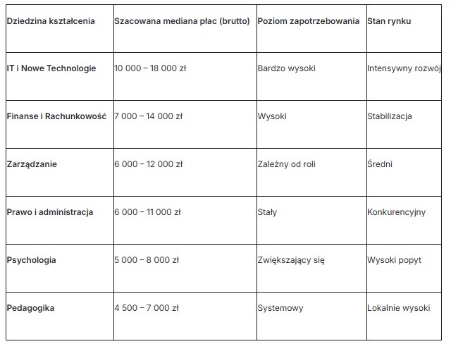 Kwestie finansowe są jednym z głównych czynników przy podejmowaniu decyzji o dalszej nauce. Poniższa tabela przedstawia szacunkowe dochody oraz poziom zapotrzebowania na specjalistów: