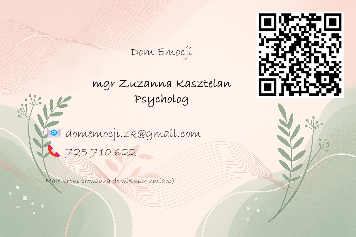 Jeśli czujesz, że to dobry moment, aby zadbać o siebie, zrób pierwszy krok i umów się na pierwszą konsultację pod numerem 725 710 622 lub przez profil Dom Emocji mgr Zuzanna Kasztelan na Facebooku